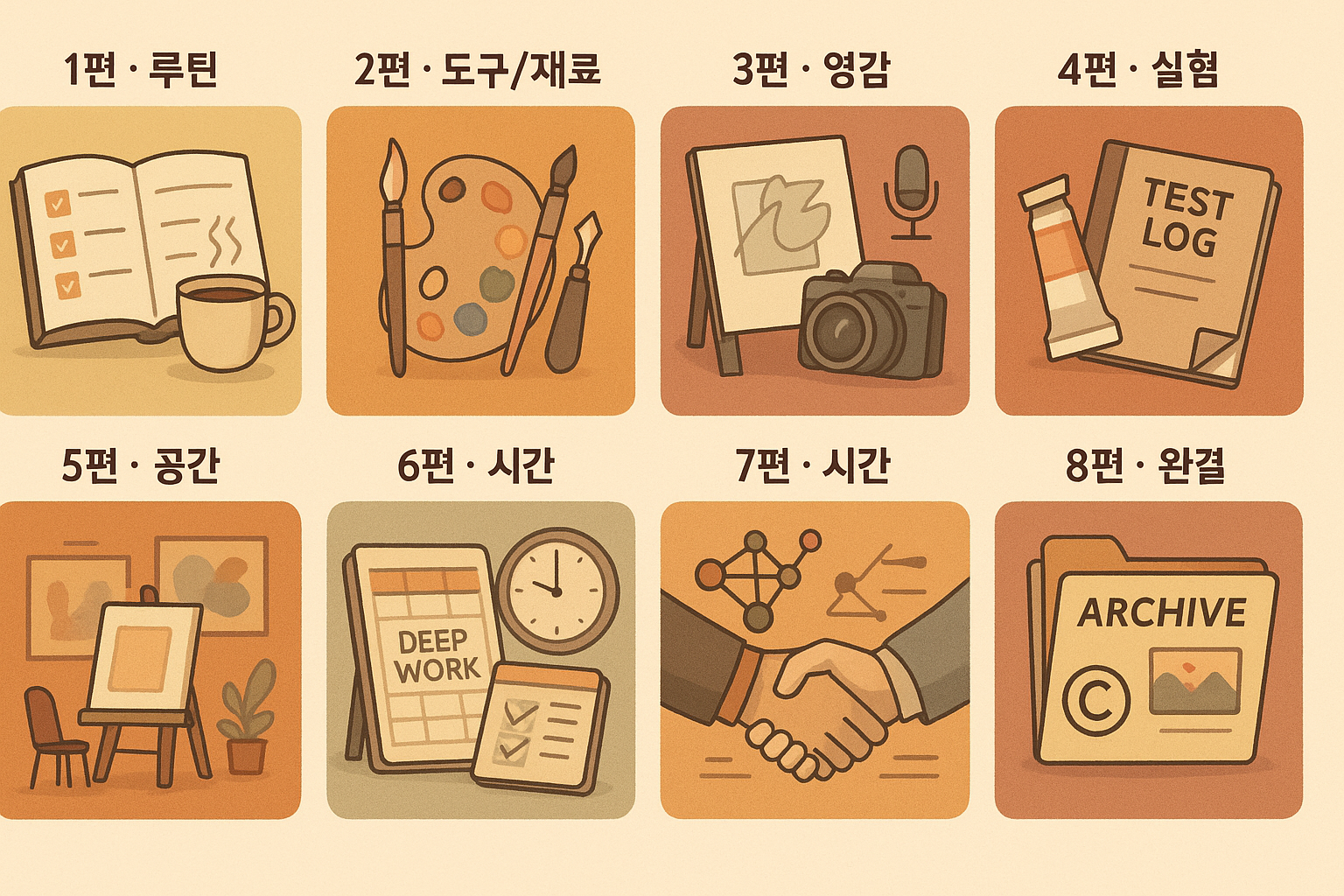 읽는 순서 추천: ① 루틴 → ② 도구·재료 → ③ 영감 → ④ 실패·실험 → ⑤ 공간 심리 → ⑥ 시간 관리 → ⑦ 협업 → ⑧ 아카이브