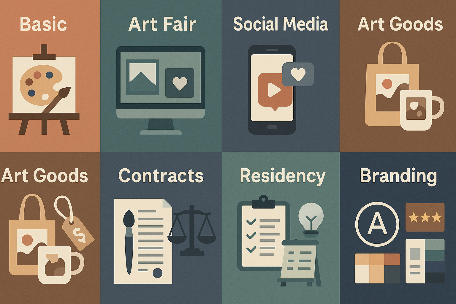 읽는 순서 추천: ① 비즈니스 기본 → ② 아트페어 → ③ SNS → ④ 굿즈 → ⑤ 계약/저작권 → ⑥ 가격/협상 → ⑦ 레지던시/펀딩 → ⑧ 브랜딩