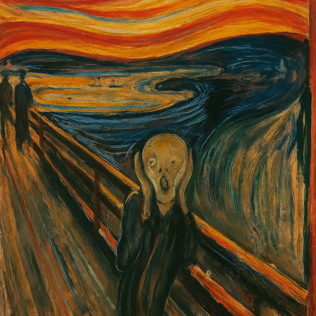 뭉크는 불안·죽음·사랑의 강렬한 감정을 선·색의 파동으로 시각화했습니다. 흔들리는 수평선, 소용돌이 하늘, 인물의 비명은 정서 파장 자체로 읽힙니다.